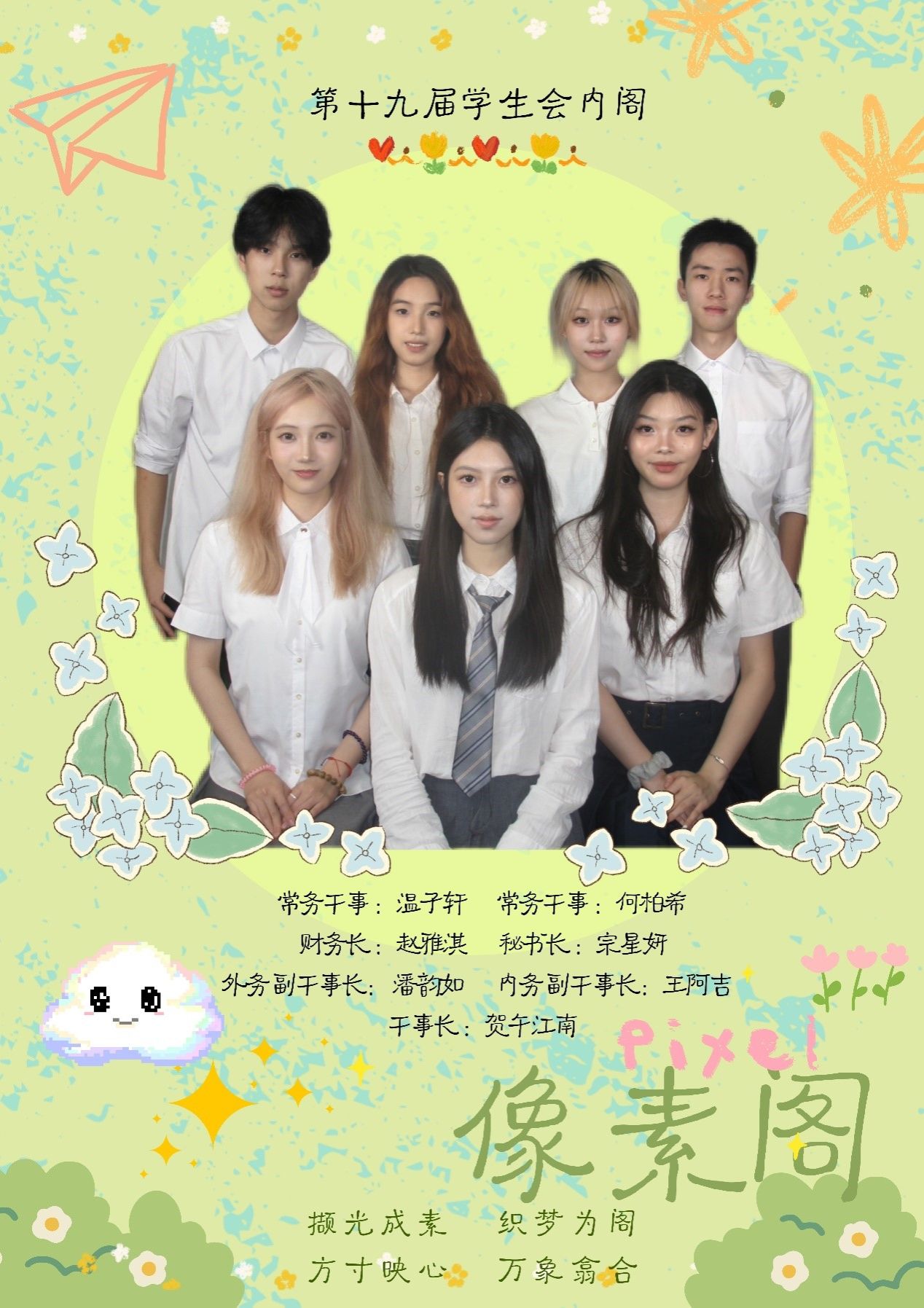 现任学生会干事会内阁为像素阁:干事长贺午江南,内务副干事长王阿吉,外务副干事长潘韵如,秘书长宗星妍,财务长赵雅淇,常务干事何柏希,常务干事温子轩。