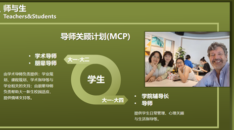 导师关顾计划(Mentor Caring Programme, 简称MCP)是全体学生与学校建立紧密联系的重要桥梁。在校生都将纳入MCP这一温馨大家庭中,MCP由学术导师、导师、学院辅导长、朋辈导师(高年级学生)及在校生五部分组成。
